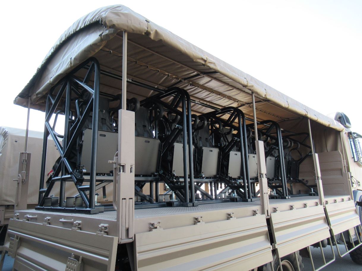 El sistema de asientos antivuelco permite el transporte seguro de tropas, presentándose como una robusta estructura con cuatro asientos con especial seguridad para cabeza y hombros, frente a impactos frontales y laterales, contando con cinturones de seguridad de cuatro puntos que asegura la integridad física de los usuarios. Ha sido testado según la normativa sobre estructuras ECE R66 y puede montarse en diferentes vehículos de transporte.