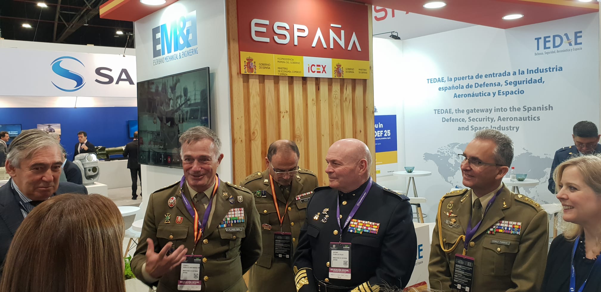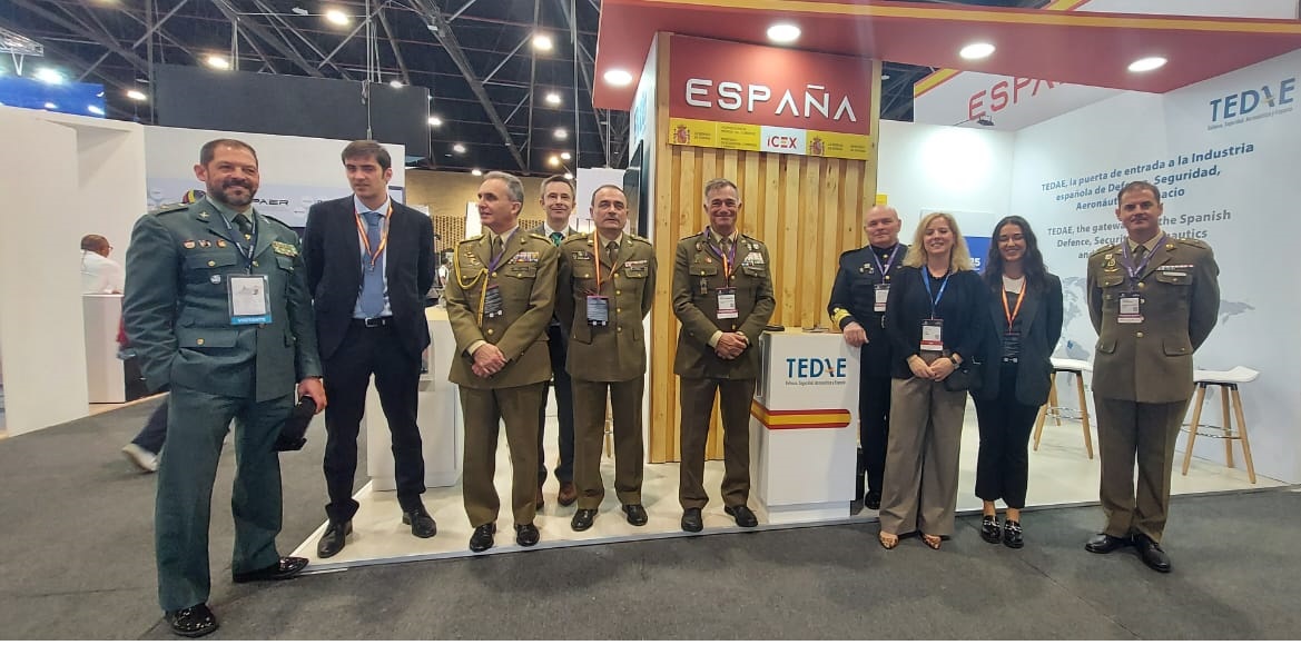 Foto: El pabellón de España en Expodefensa 2023 (de izquierda a derecha), Teniente Coronel Carlos del Moral (Oficina de Enlace en Colombia de la Guardia Civil), Alvaro Villalobos (Hisdesat), Coronel Porrúa (Agregado de Defensa en Colombia), Julio López (Hisdesat), Teniente Coronel Rosas (OFICAEX),General Sáenz de Santa María, (Jefe de la OFICAEX), General de División Antonio Planells (Adjunto al DIGAM), Clara Tébar (Directora de Operaciones de TEDAE), Laura Martín (TEDAE) y Comandante Francisco Irache (OFICAEX)