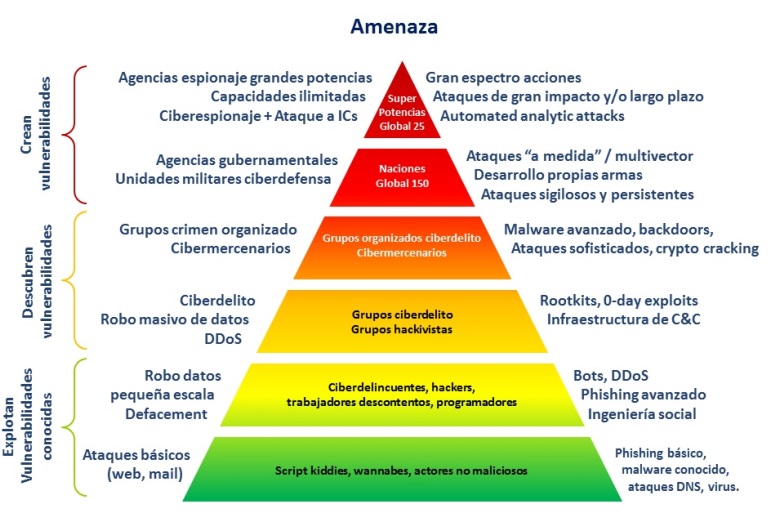 objetivo pueden ser explotadas por los atacantes, así como la heterogeneidad y volumen de la amenaza, tras la cual hay infinidad de motivaciones y que abarca desde individuos aislados hasta actores estatales con enorme capacidad. Amenaza que, además, se multiplica día tras día, incrementando también la complejidad y sofisticación de las técnicas de ataque.