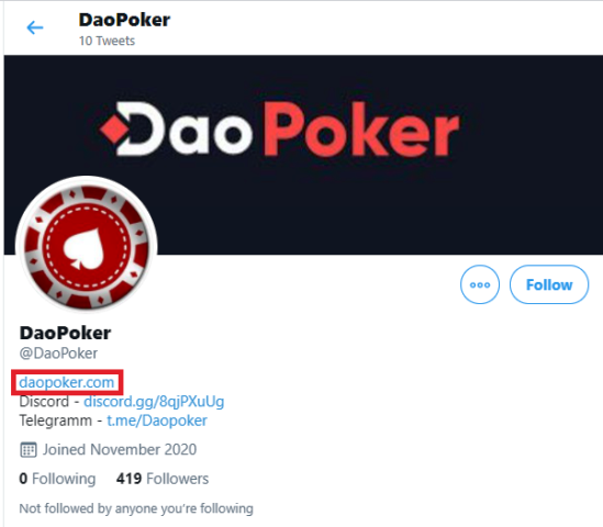 El atacante hizo un esfuerzo adicional para crear personas de Twitter y Telegram para la aplicación " DaoPoker ", además de pagarle a un influencer por publicidad. La Figura 6 muestra la página de Twitter de DaoPoker. La Figura 7 muestra eTrade promocionado por un anunciante de redes sociales con más de 25.000 seguidores en Twitter.