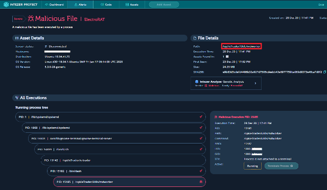 Jamm, DaoPoker y eTrade se crearon utilizando Electron, una plataforma de creación de aplicaciones. ElectroRAT está integrado dentro de cada aplicación. Una vez que la víctima ejecuta la aplicación, se abre una GUI inocente, mientras que ElectroRat se ejecuta oculto en segundo plano como "mdworker". La Figura 3 anterior muestra la GUI de la aplicación eTrade en tiempo de ejecución en una máquina de escritorio Ubuntu infectada. La Figura 11 muestra cómo se ve la infección entre bastidores utilizando la plataforma de protección de cargas de trabajo en la nube de Intezer, Intezer Protect.
