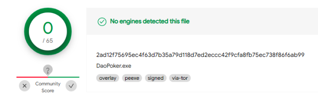 La aplicación troyanizada y los binarios de ElectroRAT se detectan poco o no se detectan por completo en VirusTotal en el momento de escribir este artículo. La Figura 12 muestra la tasa de detección de la aplicación DaoPoker firmada en VirusTotal.