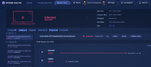 La ejecución del Endpoint Scanner de Intezer le proporcionará visibilidad del tipo y origen de todo el código binario que reside en la memoria de su máquina. La Figura 13 muestra un ejemplo de un punto final infectado con ElectroRAT.