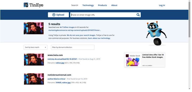Supongamos que ahora nos interesa saber en cuántas páginas webs está cierta imagen. Podemos hacerlo a través de la aplicación de búsqueda de imágenes Tineye:
