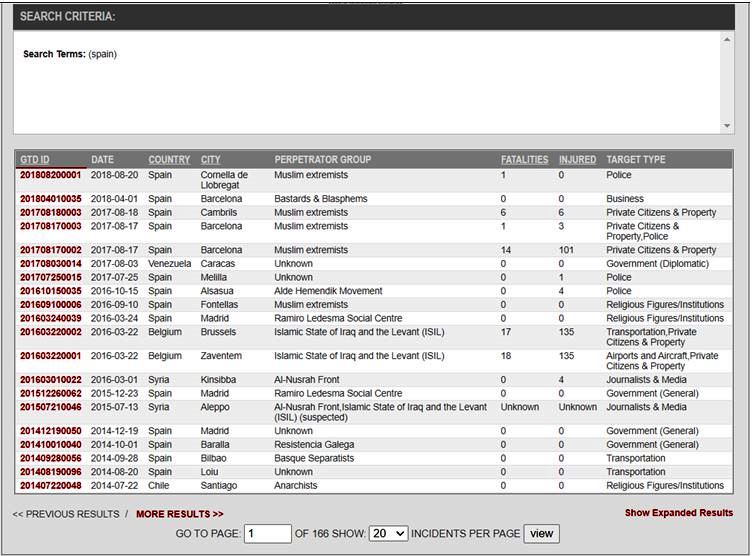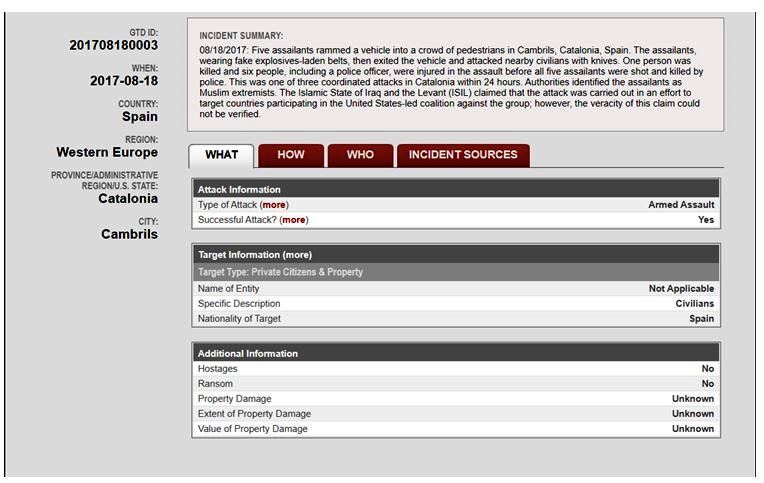 Podemos ver que se muestran, por ejemplo, los atentados que ocurrieron en Barcelona y Cambrils en el mes de Agosto del 2017. Si hacemos click en su ID nos redirige a una página en la que se nos muestra un pequeño resumen de lo que ocurrió y también si el atentado fue exitoso.