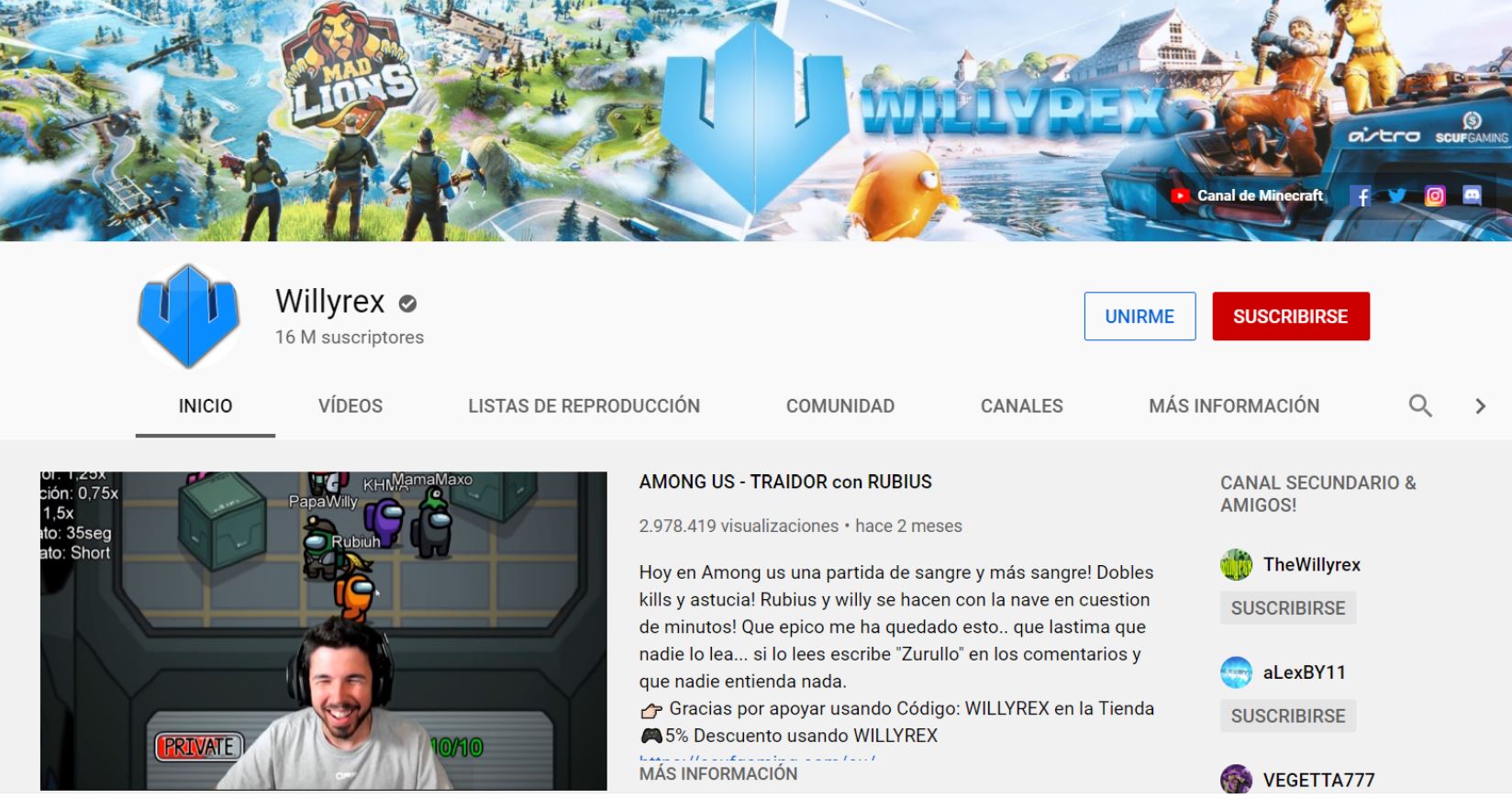 Aquellos resultados que salen en azul oscuro son en los que la aplicación ha encontrado el nombre de usuario “Willyrex”. Y efectivamente, si hacemos click en Youtube la aplicación nos envía directamente a su canal: