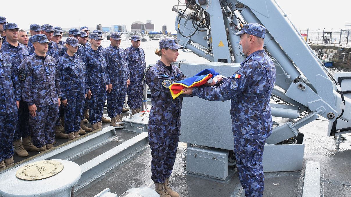 Entrega de la bandera del “Capitan Constantin Dumitrescu” en la base naval de Rosyth. (foto Forțele Navale Române)