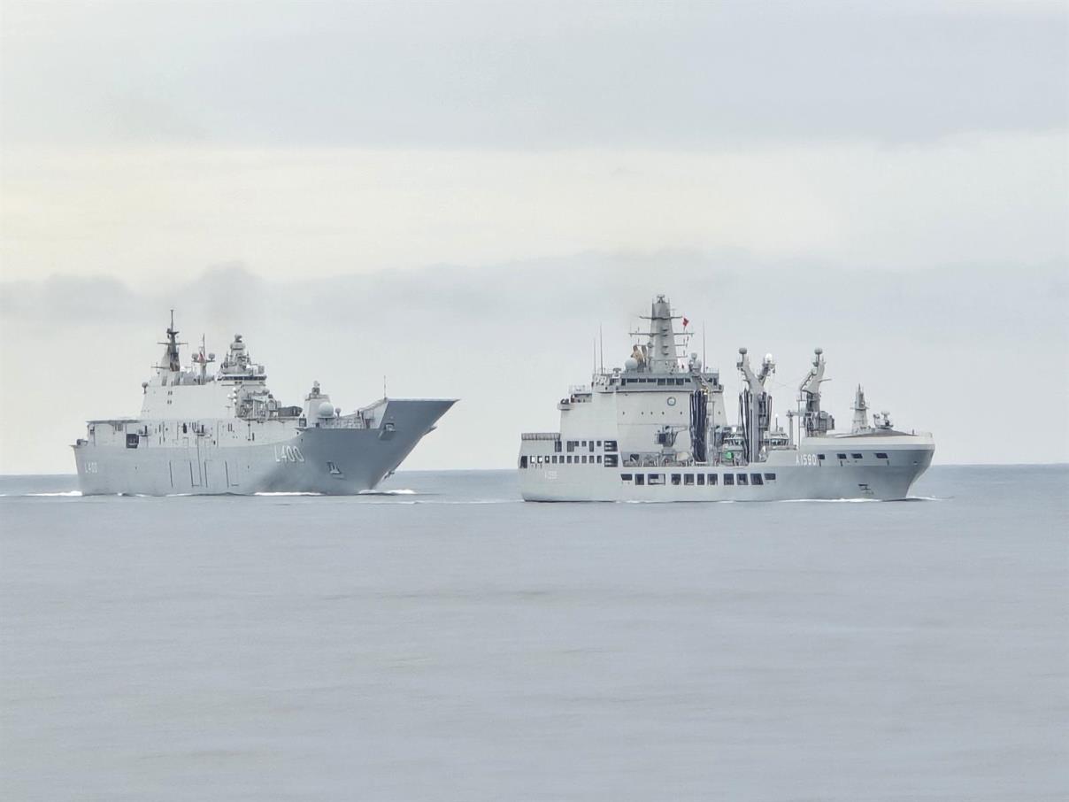 El LHD “Anadolu” (izquierda) navegando junto al navío logístico “Derya”. (foto EMAD)