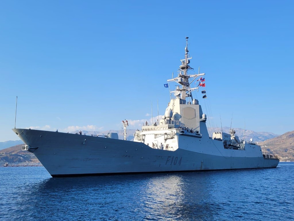 La fragata española “Méndez Nuñez” saliendo de la base naval griega de Suda. (foto Armada española)