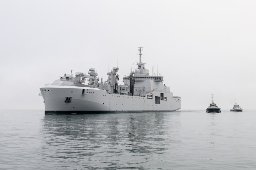 El Jacques Stosskopf (A726) segundo buque de reabastecimiento de flota (BRF) zarpando de la Base Naval de Toulon para su despliegue de larga duración. (Créditos: Marine Nationale)