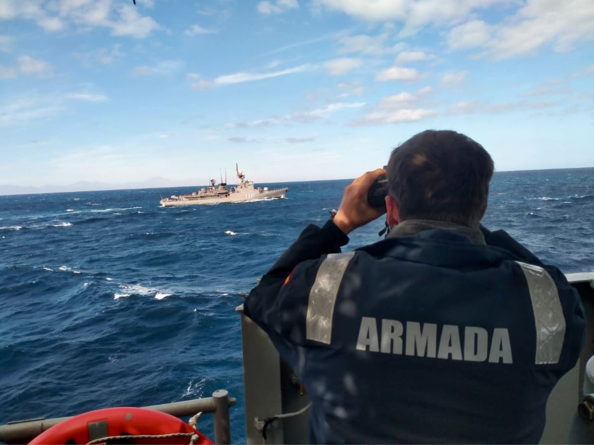 Un marino español observa con sus prismáticos a la corbeta egipcia “Abu Qir”. (foto Armada española)
