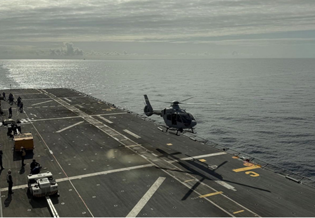 El H135 P3H “NIVAL 02” tomando a bordo del navío de asalto anfibio "Juan Carlos I”, buque insignia de la Armada. (Foto Armada española)