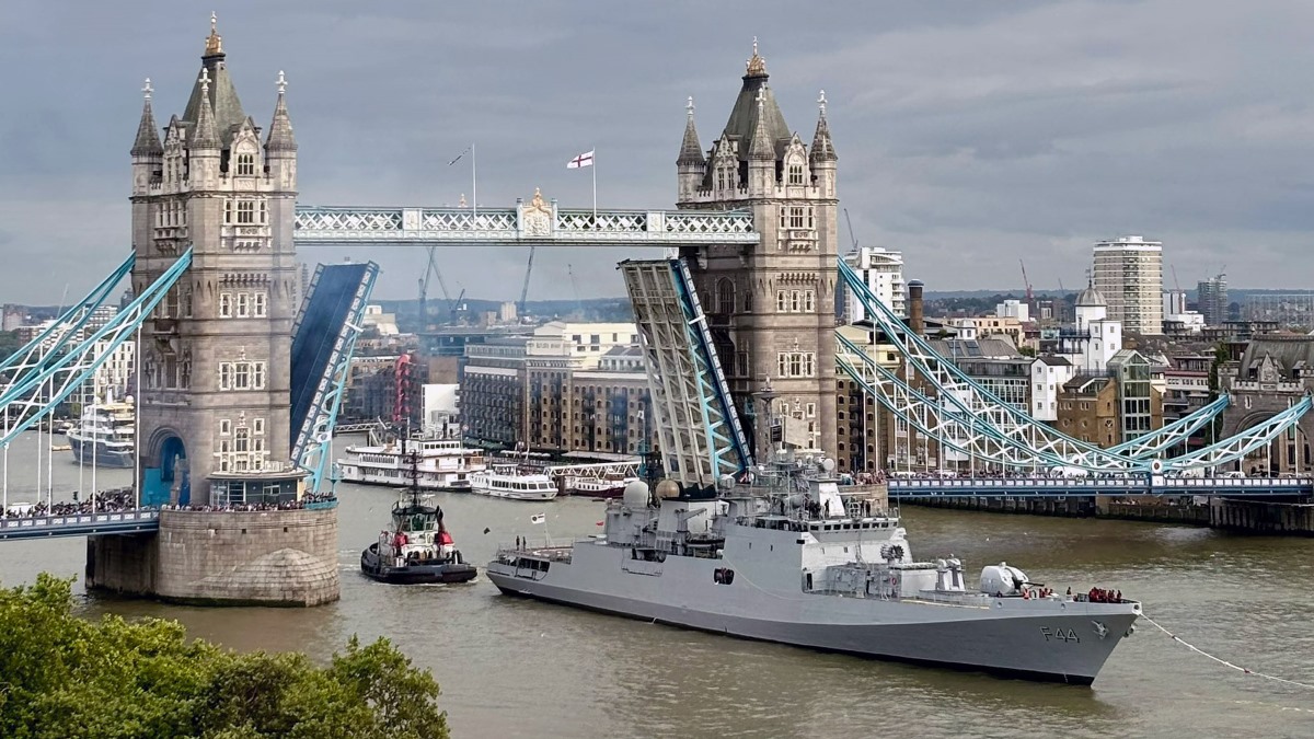 La fragata INS “Tabar” pasando, con ayuda de remolcadores, bajo el puente victoriano de la torre de Londres. (foto Indian Navy)