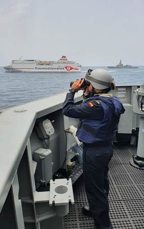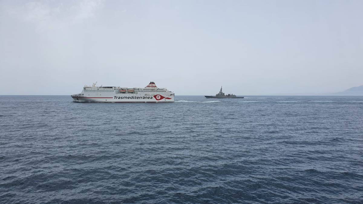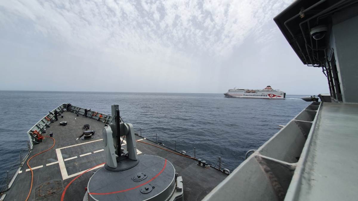 Los pasajeros que el pasado 6 de julio realizaban el trayecto entre las ciudades españolas de Málaga y Melilla, a través del mar de Alborán, a bordo de dicho ferry de la compañía Trasmediterránea pudieron ver navegando, por ambos costados, a esos buques de combate.