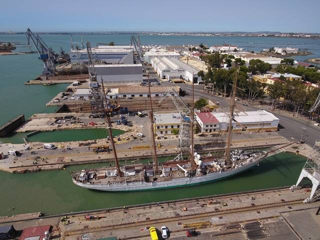 El Buque Escuela de la Armada Española, el Juan Sebastián Elcano, se encuentra en el astillero de Navantia en San Fernando donde será sometido a la varada reglamentaria habitual tras la finalización de su crucero de instrucción alrededor del mundo.