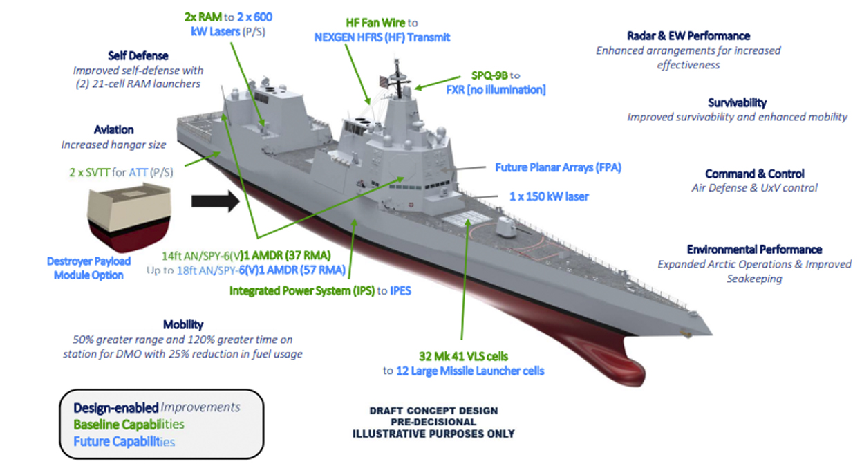 Ya se están evaluando diseños en relación con sus sensores, planta de propulsión y sobre todo planta de generación eléctrica (IPS, Integrated Power System), porque se ha previsto que se impulsen con un concepto que la usará, para reducir el ruido generado y hacerlos más difíciles de localizar, y que también será empleado por los tres sistemas láser activos -uno de 150 kilovatios y dos de 600- con los que contarán esos destructores.
