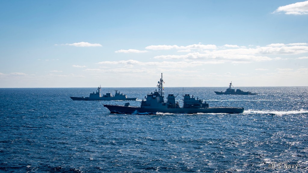 Un destructor japonés dotado de sistema Aegis durante un ejercicio conjunto reciente con buques estadounidenses (JMSDF)