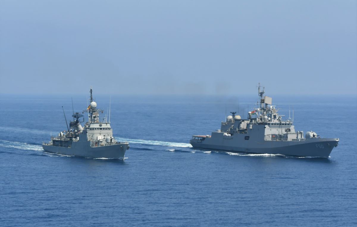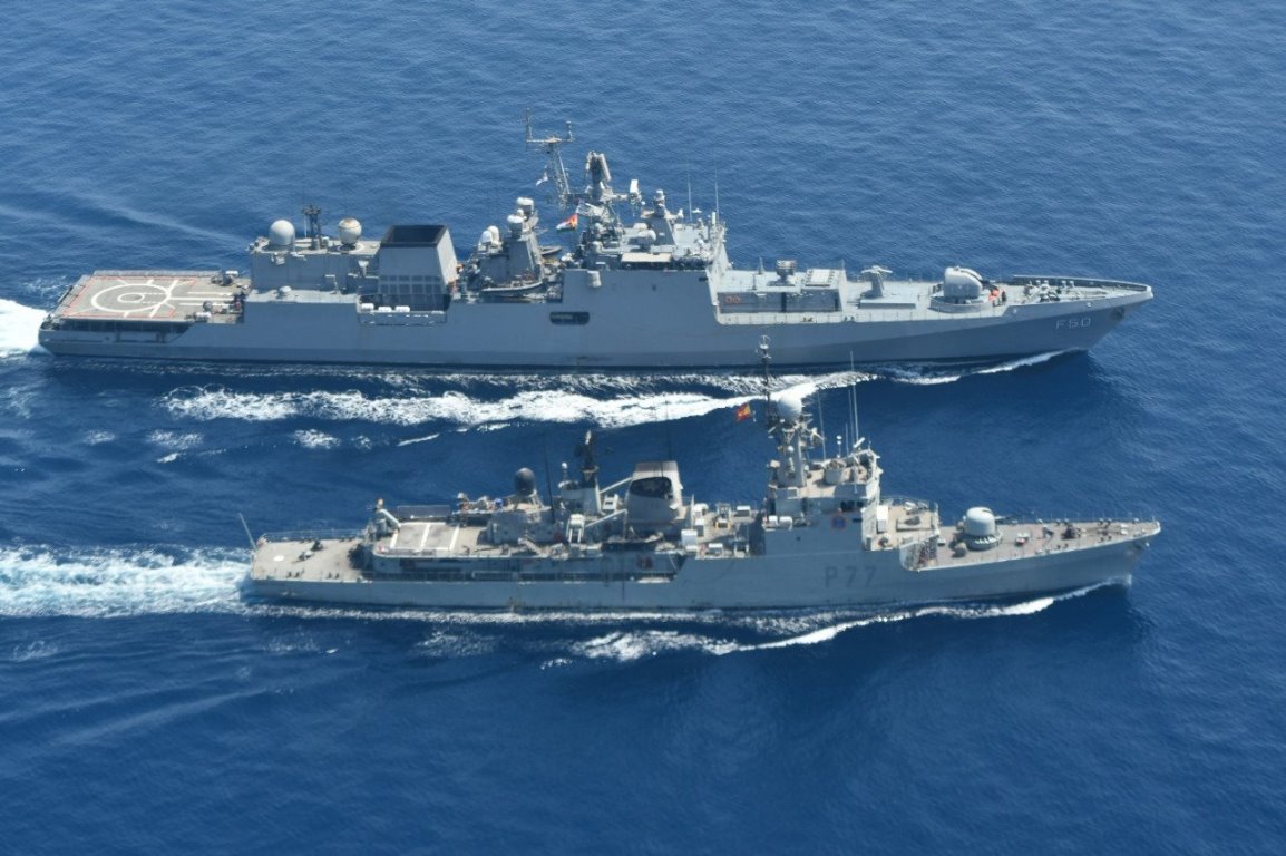 El patrullero “Infanta Cristina” (primer plano) navegando junto a la fragata “Tarkash”. (foto Marina de la India)