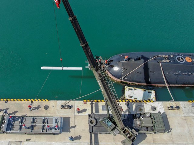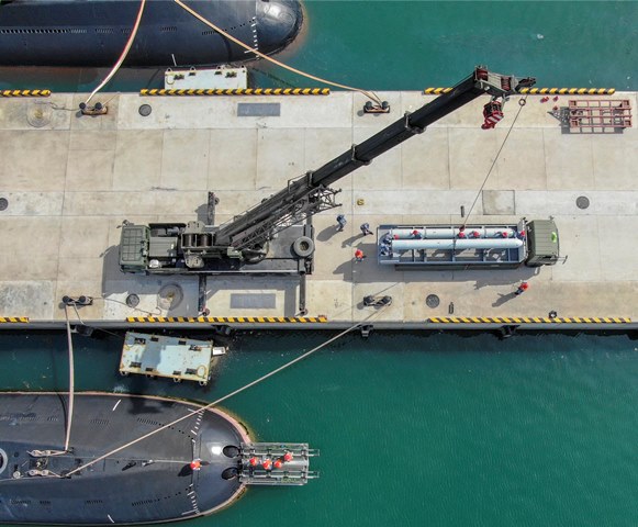 El movimiento de contenedores con misiles que pueden ser disparados en inmersion es una imagen poco habitual (W.Haodong, MD China)