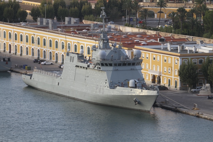 foto: El moderno OPV de la Armada española “Audaz” (P-45) atracado en su puerto base, el Arsenal de Cartagena (foto Julio Maíz).
