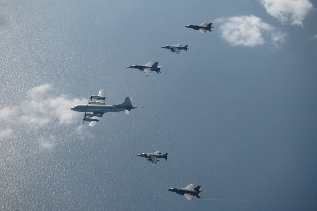 Hasta ahora no habíamos podido ver una foto tan buena de Harrier y F-35B volando en formación. La imagen fue tomada por la Marina de Alemania o Deutsche Marine desde uno de sus aviones de patrulla marítima o Maritime Patrol Aircraft (MPA) P-3C Orión en el curso de unas maniobras sobre el Mare Nostrum. En Twitter el 1 de marzo la Deutsche Marine apuntaba: “después de que un P-3C detectara un enemigo en entrenamiento en el Mediterráneo, F/A-18E (Estados Unidos), AV-8B+ (España), F-35B (Italia) despegaron de sus portaaviones. Guiados por el avión de patrulla marítima, los aviones de combate avanzaron contra el objetivo”.