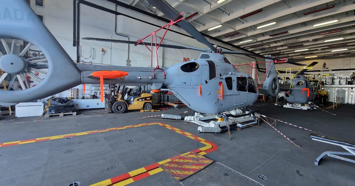 La rápida fase de integración de los helicópteros H135 en la Duodécima de la Flotilla de Aeronaves de la Armada cumple un nuevo hito con su embarque en el navío de asalto anfibio “Galicia”, es el primer embarque de estos medios.