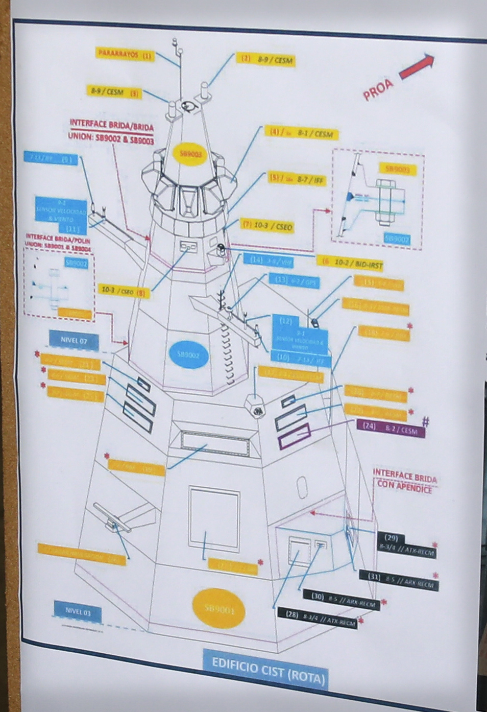 En un recorrido de arriba abajo en ese novedoso mástil integrado -al ser el del CIST puede que no sea totalmente idéntico al de las F110- que es toda una novedad para la Armada encontramos, además del pararrayos que ocupa el lugar más alto, una pareja de contenedores cilíndricos y nueve cajas poligonales con distintos equipos de apoyo a la guerra electrónica (CESM, Communication Electronic Support Measures).
