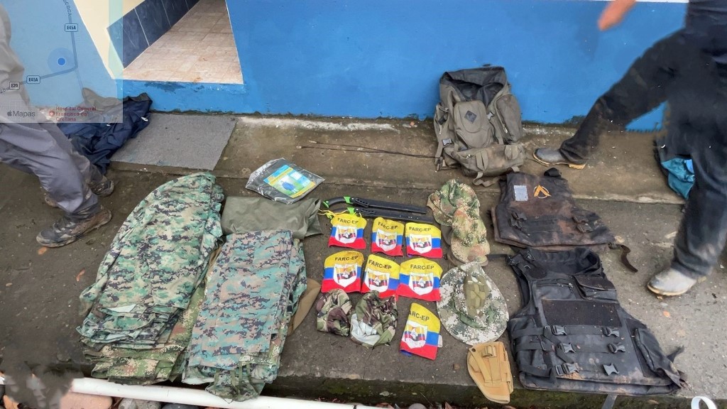 Asegurada el área, los efectivos de la IV División de Ejercito “Amazonas” incautaron 3 fusiles de asalto Spikes Tactical, de fabricación norteamericana, de diversos modelos de 5,56 x 45 mm. con 10 cacerinas, 1 escopeta Mossberg calibre 12GA y 1 pistola Beretta de 9 x 19 mm, con una cacerina, y 1.223 municiones: 1,128 cartuchos de 5,56 mm, 34 de calibre 12GA y 61 de 9 mm. Asimismo, se incautó, entre otros, 3 artefactos explosivos improvisados (AEI), 2 sierras tácticas, 2 chalecos antibalas, 6 uniformes militares y 7 parches con las siglas FARC EP.