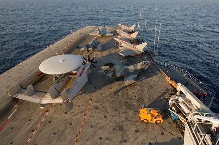 Fotografia: Aeronaves Rafale Marine, Super Étendard Modernisé e E-2C Hawkeye a bordo do FS Charles de Gaulle (Armée de l'Air).