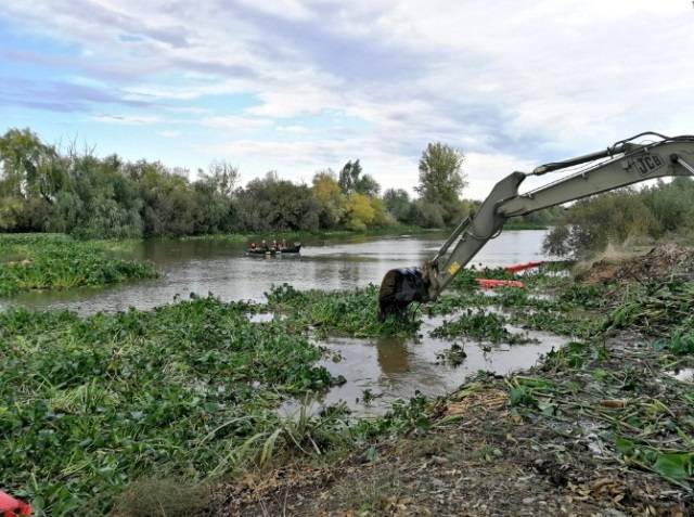 ·Este es el tipo de trabajo que realiza la UME contra el camalote. Sectorización en el río y recogida con excavadoras en la orilla (UME)