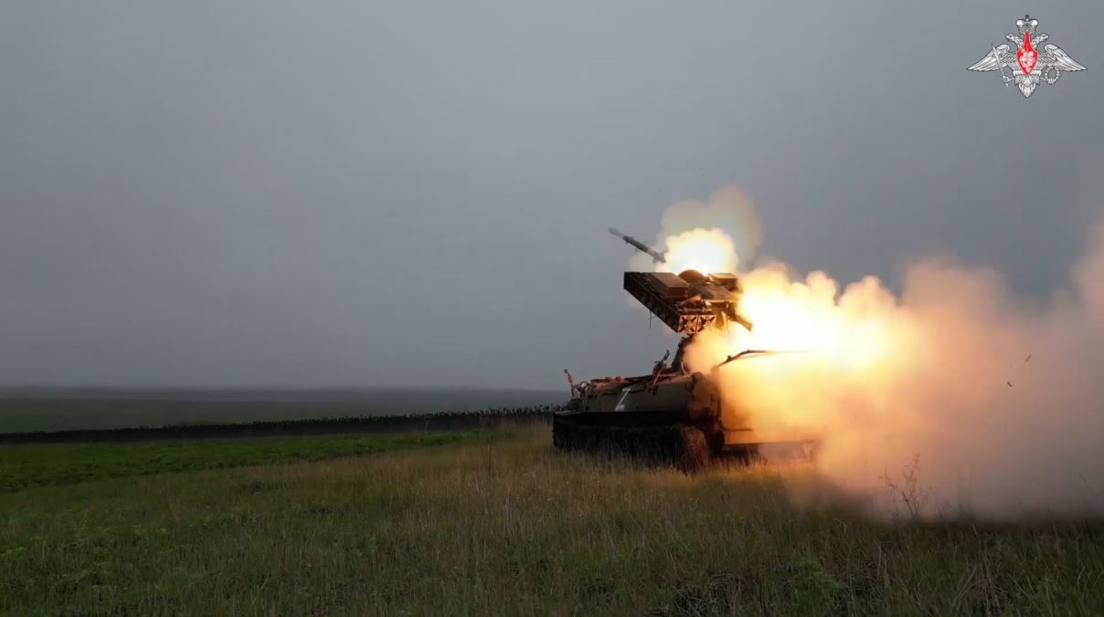 Sistema de misiles antiaéreo de baja cota 9K35 “Strela-10” haciendo fuego (foto Ministerio de Defensa ruso).
