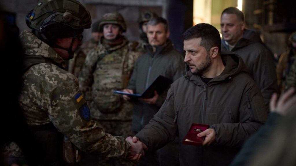 El presidente ucraniano Volodomir Zelensky imponiendo condecoraciones a las tropas que resisten en Bahmut.