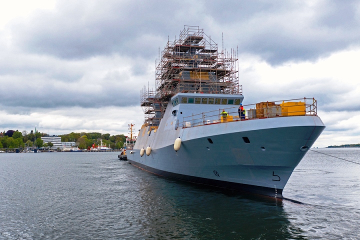 foto: La primera corbeta “Sa’ar 6”, denominada INS “Magen”, en construcción tras su botadura en los astilleros de Kiel en Alemania (foto TKMS).