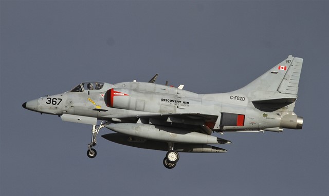 Uno de los A-4N “Skyhawk” de Discovery Air (Top Aces) aterrizando en Gando, Canarias (foto Julio Maíz).
