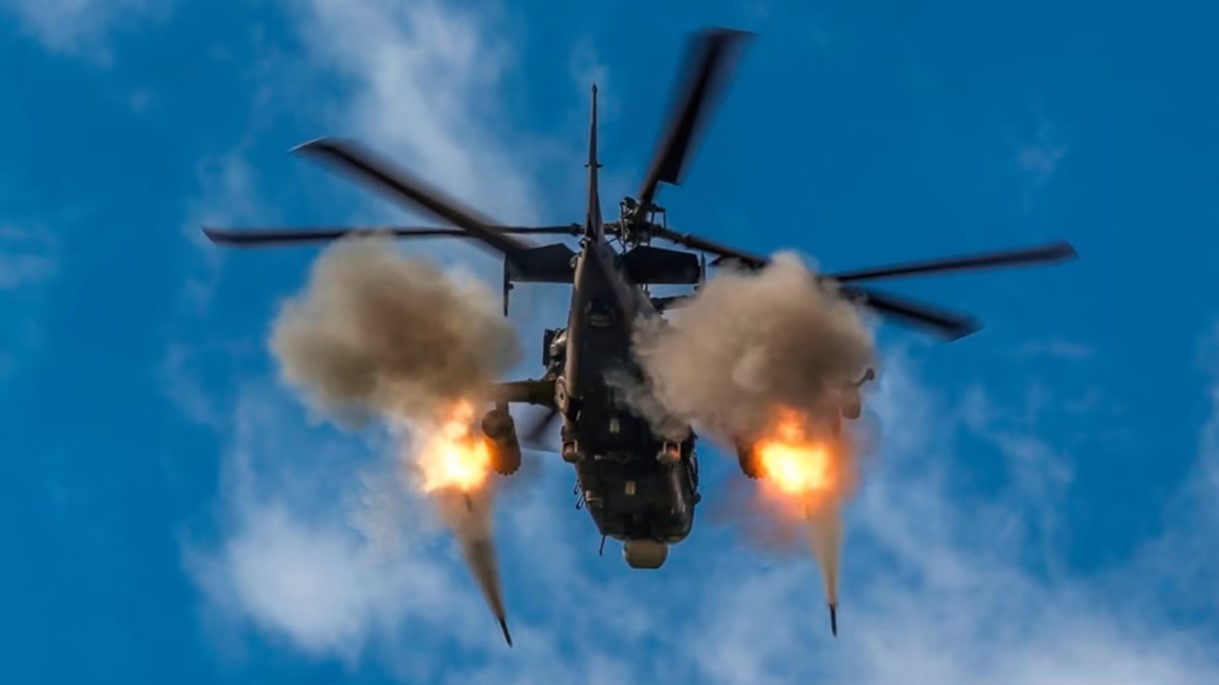 Un helicóptero de ataque Ka-52 “Alligator” abriendo fuego en los cielos de Ucrania.