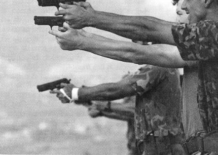 Conviene en primer lugar repasar algunos conceptos sobre la teoría del tiro. Este presenta diferentes modalidades de ejecución, según el tiempo disponible para realizar el disparo, la dirección del plano del tiro respecto al eje del blanco y la forma del terreno. Así, cuando el adversario se encuentra lejos o no advierte nuestra presencia, se podrá efectuar un tiro de precisión, sin prisas y desde una posición relativamente cómoda. Cuando en pleno combate se toman precauciones y se adoptan posiciones para protegerse del fuego enemigo, apoyando el arma en obstáculos, disparando con relativa rapidez, etc., nos hallamos ante un tiro de combate. Si acortamos aún más las distancias, como es el caso de disparar de inmediato al entrar en una habitación, sin tiempo para encarar los elementos de puntería, el tiro es instintivo, sin duda, el más practicado y útil para los boinas verdes.