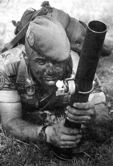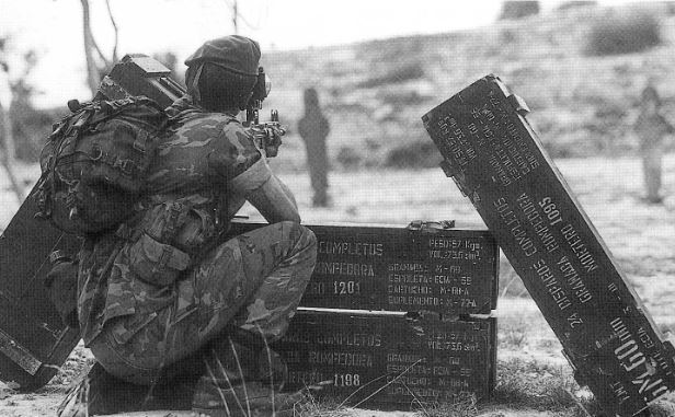foto: El mortero “Comando”, de 60 mm., consta de un tubo que lleva acoplada una pequeña placa base y goniómetro móvil, lo que permite hacer un fuego eficaz e inmediato,