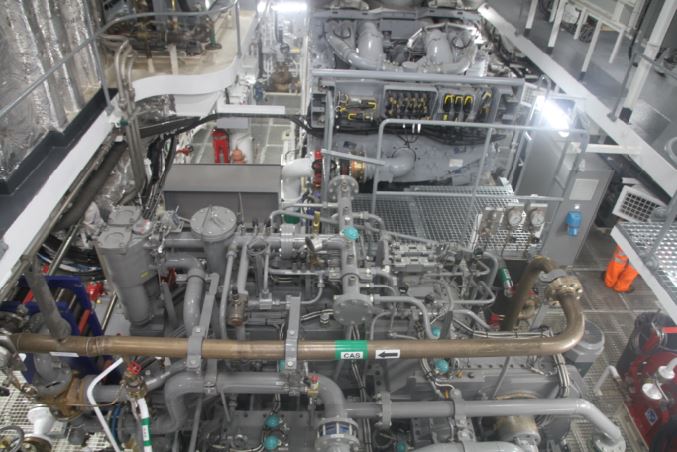 Durante la navegación se suceden los chequeos y anotaciones a lo largo y ancho de los 93,9 m. de eslora y 14,2 de manga del navío, especialmente en puntos clave, como la zona de propulsión de tipo combinada diesel o eléctrica, manejada, controlada y probada desde las consolas de la sala de control de plataforma, el puente. También se suceden las pruebas del novedoso SICC (Sistema Integrado de Control de Comunicaciones) HERMESYS, un diseño de Navantia de última generación totalmente digitalizado, nos comenta Jaime Vidal, un ingeniero de la empresa que es el director del programa de los BAM.