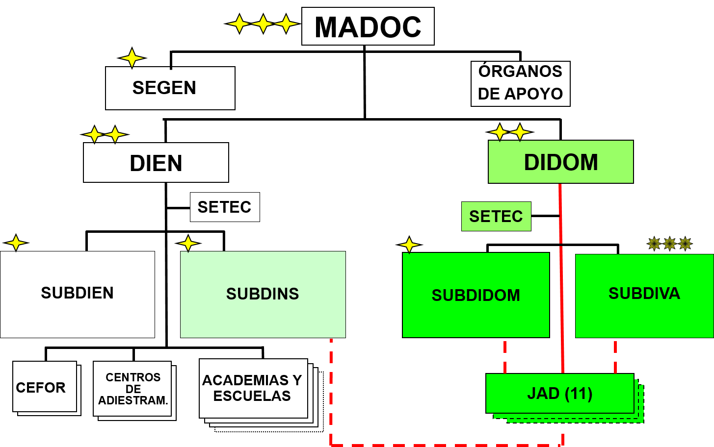 Son la Secretaría Técnica (SETEC), que es la responsable de apoyarle, proporcionar elementos de juicio en su toma de decisiones, coordinar actividades de las subdirecciones y controlar los recursos financieros; la Subdirección de Investigación y Lecciones Aprendidas (SUBDIVA), que tiene como misión, a través de acciones como las de experimentación, investigación, análisis de lecciones aprendidas y otras más, el explorar nuevas áreas del conocimiento y la gestión y difusión de lo extraído en su labor de exploración; la Subdirección de Doctrina, Orgánica y Materiales (SUBDIDOM), que se encarga de transformar ese conocimiento adquirido en capacidades tangibles, tan relevantes como revisar la doctrina existente y elaborar nueva, impulsar cambios en la organización o hacer frente a las necesidades de materiales futuras; y las jefaturas de Adiestramiento y Doctrina (JAD) que, consideradas como verdaderos músculos de la Dirección, apoyan todo el proceso que permite transformar en realidad las buenas ideas.