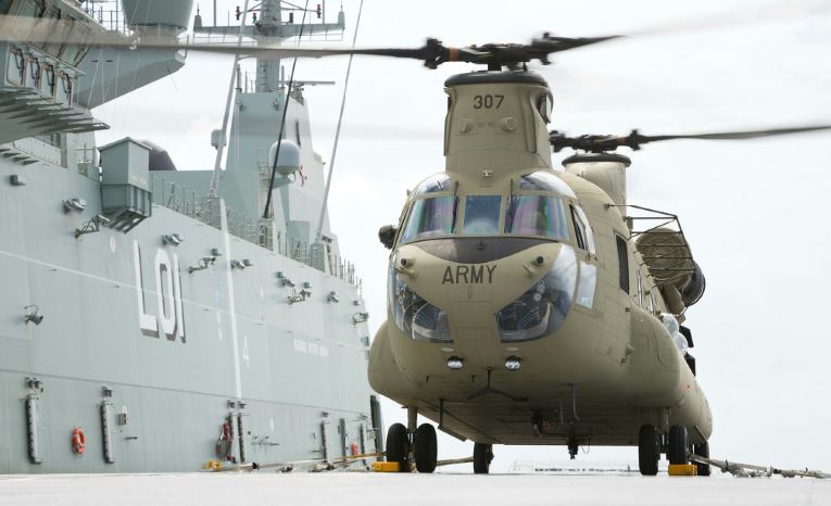 Foto: Uno de los CH-47F australianos operando desde el navío anfibio L01 HMAS “Adelaide” (foto Ministerio de Defensa de Australia).