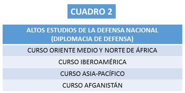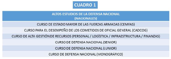 n Curso para el Desempeño de los Cometidos de Oficial General (CADCOG): La importancia de este curso es trascendental. Los coroneles y capitanes de navío seleccionados por los ejércitos (Tierra, Mar y Aire) y la Guardia Civil deben asistir y su superación constituye requisito sine qua non para optar al ascenso a oficial general. Está igualmente sometido a un proceso de continua mejora y actualización. Su currículo también fue aprobado en 2017 y un nuevo formato, más participativo y virtual, se pondrá en marcha a partir de 2018.