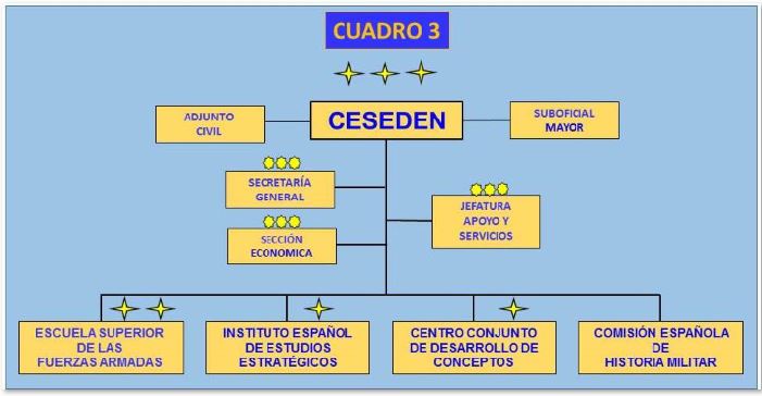 En la práctica el CESEDEN, a través de la ESFAS, imparte una serie de estudios que podrían agruparse en las siguientes categorías: Altos Estudios de la Defensa Nacional, de carácter interno (cuadro 1), o con vocación internacional (cuadro 2) y Perfeccionamiento Conjunto (curso superior de inteligencia, fase conjunta del ascenso a comandante/capitán de corbeta y el curso de planeamiento operativo). Además, la ESFAS dirige y coordina el diseño y ejecución de otros cursos, también de carácter conjunto, en las áreas de inteligencia, ciberdefensa y targeting (adquisición de objetivos). La ESFAS, como se viene diciendo, forma parte del CESEDEN (cuadro 3), junto al Instituto Español de Estudios Estratégicos, el Centro Conjunto de Desarrollo de Conceptos y la Comisión Española de Historia Militar.