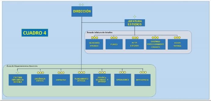 La organización de la ESFAS (cuadro 4) deriva lógicamente de su misión y se orienta hacia la consecución de sus objetivos docentes. En este año que ahora concluye la Escuela ha sufrido una significativa reorganización para adaptar su estructura a las nuevas modalidades de enseñanza y al empleo de las nuevas tecnologías. Así, actualmente se organiza en tres áreas básicas: la Dirección, la Jefatura de Estudios y los Departamentos Docentes. La Dirección la ejerce un oficial general (dos estrellas), que puede ser del Ejército de Tierra, de la Armada o del Ejército del Aire (lo habitual es que se produzca una rotación en el puesto). En la actualidad el cargo es ocupado por un general de división de la Armada (Cuerpo de Infantería de Marina), al cual hemos tenido la oportunidad de entrevistar.