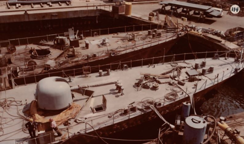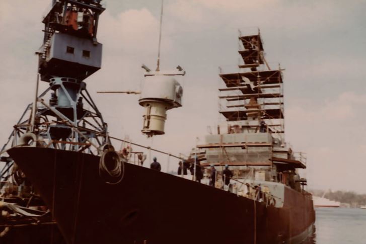 Maniobra de montaje del cañón de 76 mm en la FM-51 ARC “Almirante Padilla” durante su construcción (foto Armada de Colombia).