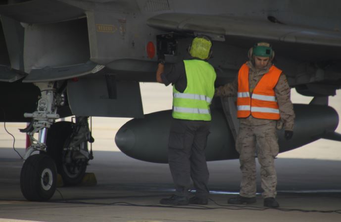 Foto: Un mecánico y un armero realizan las últimas comprobaciones antes de lanzar un “Eurofighter” (foto Julio Maíz).