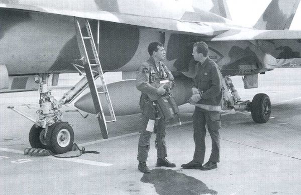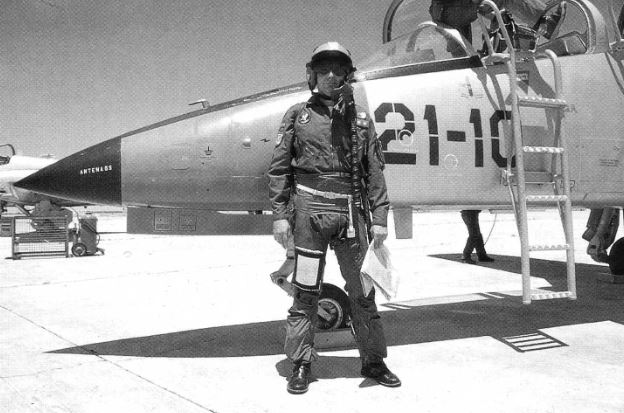 foto: El capitán Agustín Quesada, del 211 Escuadrón, posando junto a un C-101B en junio de 1995.