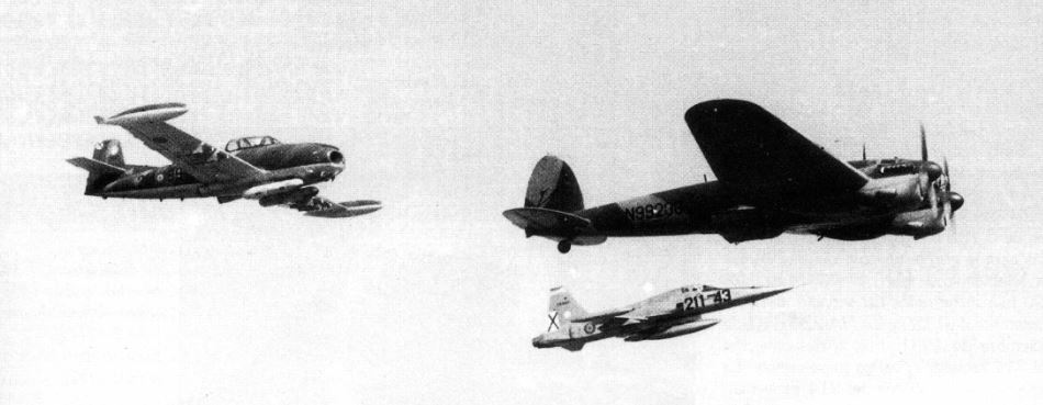 foto: Un F-5A del 211 Escuadrón y un “Super Saeta” del 214 Escuadrón escoltando a un CASA 2111, con matrícula civil norteamericana. Estos aparatos sirvieron en Morón con el Ala 27 (Foto: Ala 21).