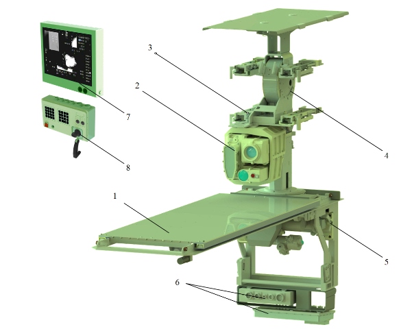 Foto: Fig. 3: Unidad de lanzamiento automatizado (ALU): (1) techo corredizo; (2) visor TV/IIR; (3) guías de misil; (4) SGM; (5) montura con mecanismo de elevación; (6) componentes electrónicos; (7) monitor; (8 ) consola de operador.