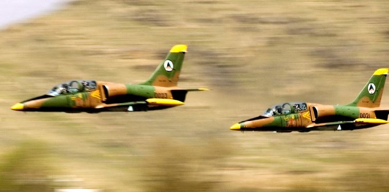foto: Un par de L-39C de la Fuerza Aérea afgana en vuelo de instrucción a baja cota y alta velocidad (foto USAF).