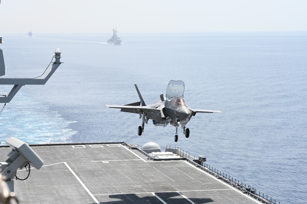 Operaciones de un F-35B de la MMI a bordo del portaaviones "Cavour" con el sobrevuelo de 2 F-35B del US Marine Corps.